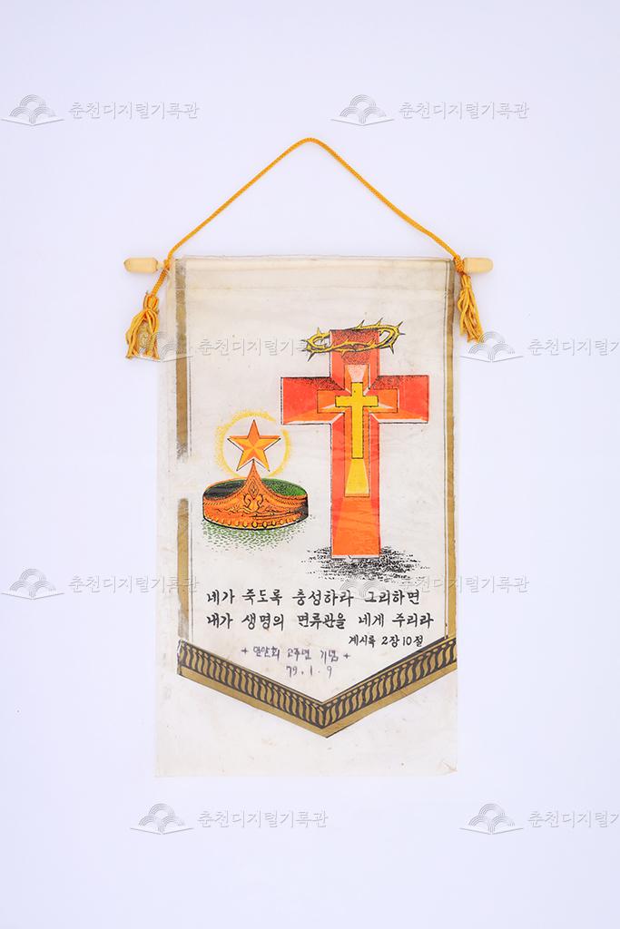 밀알회 2주년 기념 페넌트 등록번호 00017928 생산일자 1979.01.09 생산지역 미상 생산자 밀알회 수집처 이춘희 소장자 춘천학연구소 내용 1979년 1월 9일 밀알회 2주년을 기념하기 위해 제작된 페넌트이다. 요한계시록 2장 10절의 구절이 적혀있다. 사용안내 비상업적 이용만 가능|©춘천디지털기록관 상업적 사용·수정·재배포는 저작권자 동의 필요 다운로드 목록보기