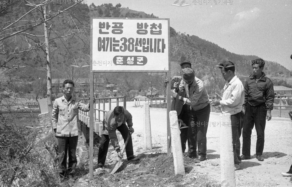 38선 표지판설치 등록번호 00016494 생산일자 미상 생산지역 사북면 원평리 생산자 미상 수집처 이경애 소장자 이경애 내용 춘성군 사북면 원평리 말고개 입구에 38선 위치 표지판을 세우는 모습이다. 사용안내 비상업적 이용만 가능|©춘천디지털기록관 상업적 사용·수정·재배포는 저작권자 동의 필요 다운로드 목록보기