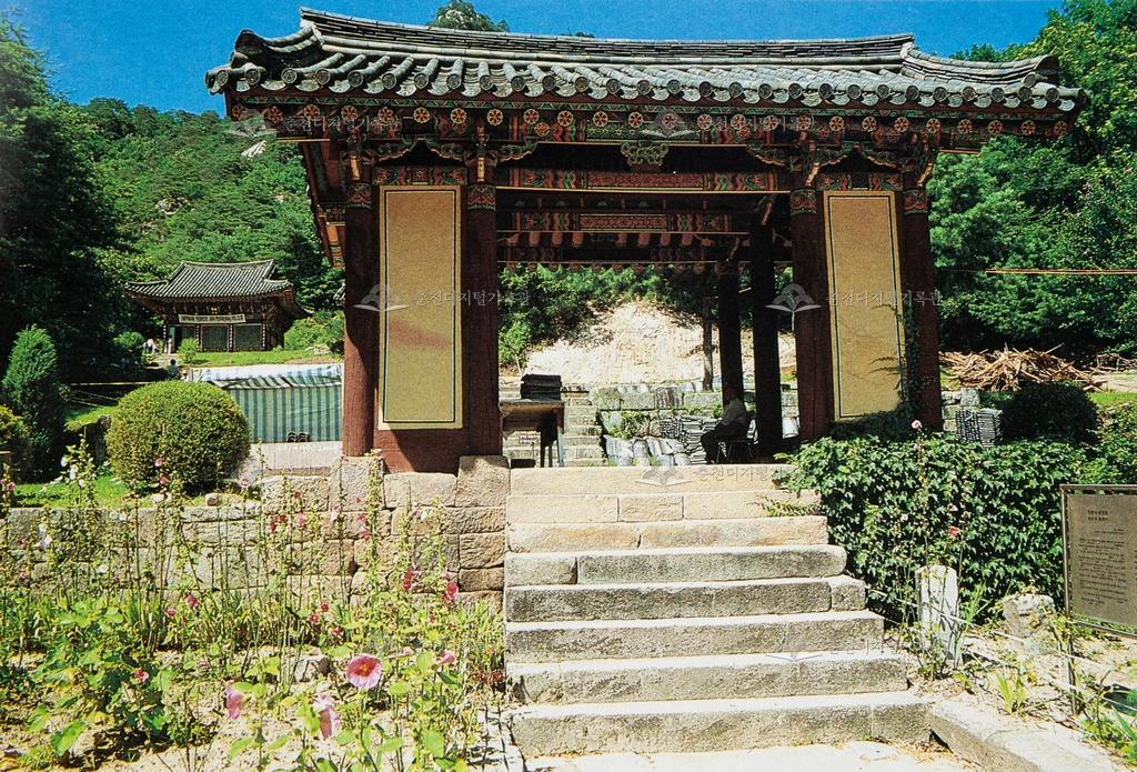 공포(栱包)의 형식은 주심포계(柱心包系)에서 익공계(翼工系)로 변하는 과정을 보여주고 있으며, 내부가구(內部架構)는 중앙 좌우에 기둥을 하나씩 세워 대들보를 받치게 하였고, 그 상부에는 홍전(紅箭)을 가로로 배열하여 문으로서의 표시를 하고 있다. 건물의 성격에 알맞게 간소하게 꾸며진 맞배집이다. 이 문 좌우에는 행각(行閣)이 연결되었었으나 극락전(極樂殿) 등과 함께 6.25 동란(動亂) 때 소실(燒失)되었다. 『춘주문화재(1988)』 사진,내용 발췌