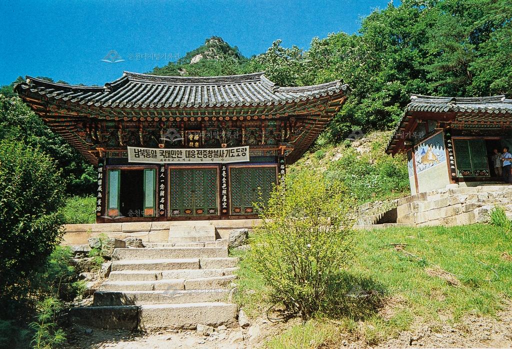 법당(法堂) 남쪽에 일루(一樓)가 있으니 명일(名日) 강산각(降山閣)이라 선왕 삼위(先王 三位)의 판(版)을 만들어 봉안(奉安)하고 있다. 『춘주문화재(1988)』 사진,내용 발췌