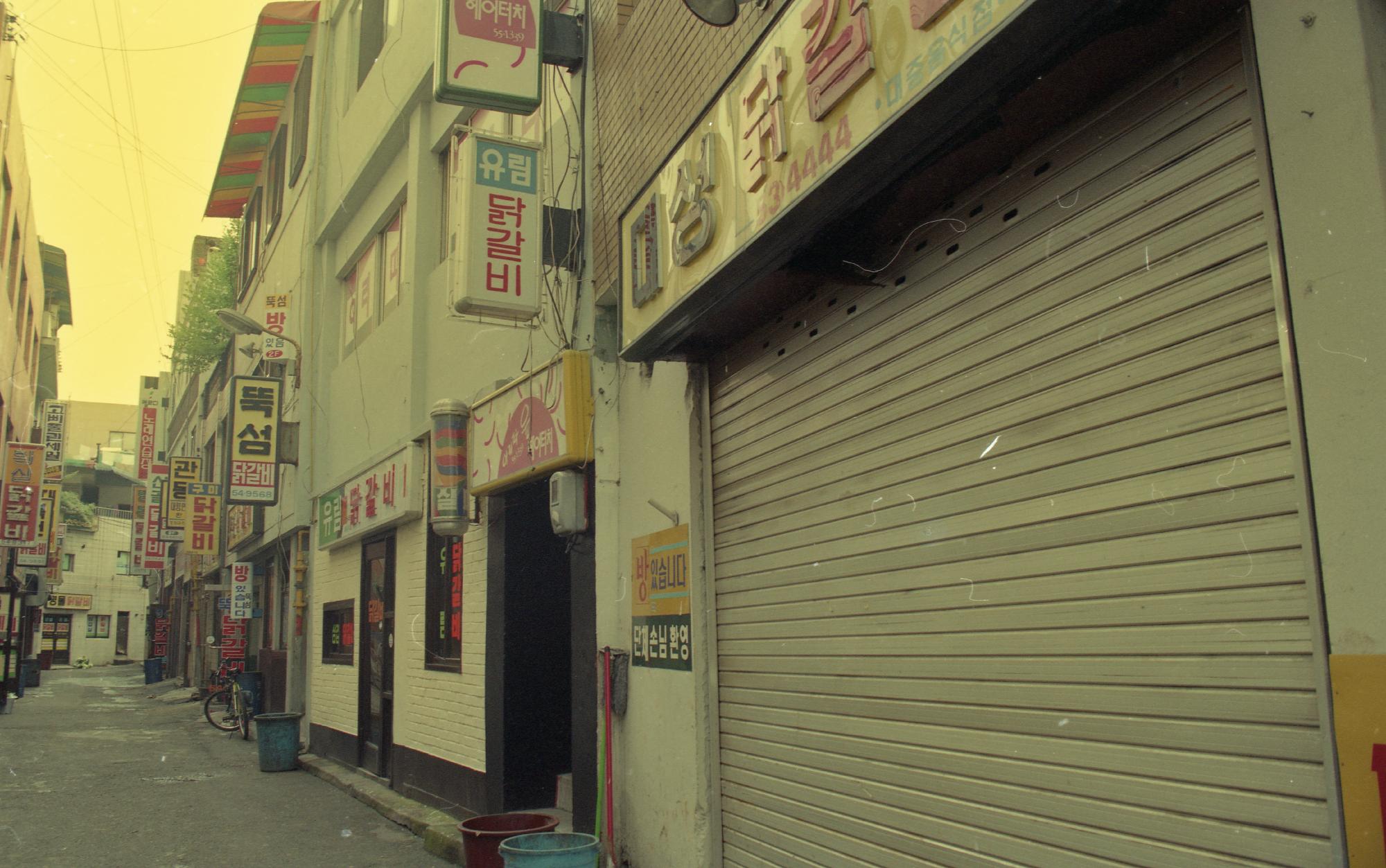 1980년대 명동 닭갈비 골목 풍경이다. 대성닭갈비, 유림닭갈비, 뚝섬닭갈비, 구미닭갈비, 산골 닭갈비, 명동닭갈비, 황실닭갈비, 명물닭갈비 간판이 보인다.