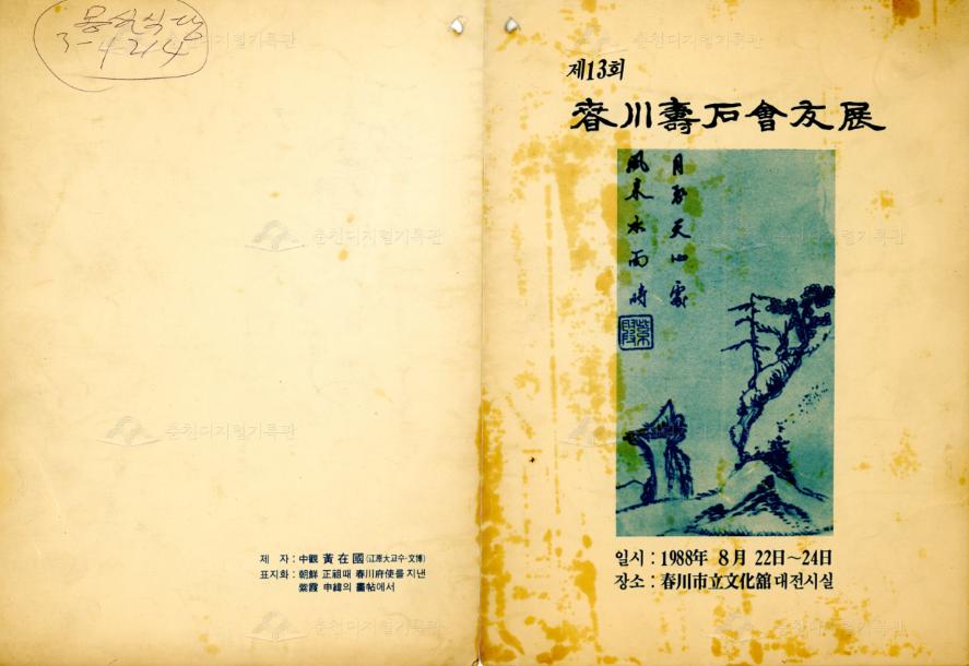 1988년 8월 22일부터 24일까지 3일 간 춘천시립문화관 대전시실에서 개최된 춘천수석회우전 리플릿이다 모두 4면으로 1면에 전시회 제목, 일시, 장소가, 2면에는 회장 김병두(전 강원도교육감)의 초대의 글, 3면에는 회원 명단이, 4면에는 표지 제자, 표지화 정보가 기재되어 있다. 제자(題字)는 강원대 황재국 교수가 쓰고, 표지화는 조선 정조시기 춘천부사를 지낸 자하 신위의 화첨에서 발췌하여 사용하였다. 춘천수석회는 1976년 결성되어 매년 수석 전시회를 개최하였다. 1980~90년대에는 수석 취미 열풍으로 춘천에 4~5개의 수석회가 활동하였다.
