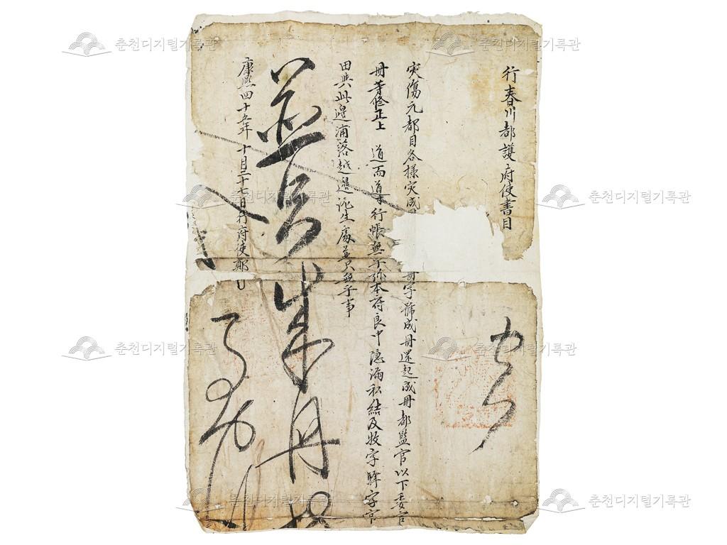 조선 숙종 32년(1706년) 10월 27일에 춘천도호부사 정아무개가 올린 서목(書目)이다. 고을의 재해 사항을 조사하여 기록한 재상도목(災傷都目)을 엮는 일과 관련된 내용이다.