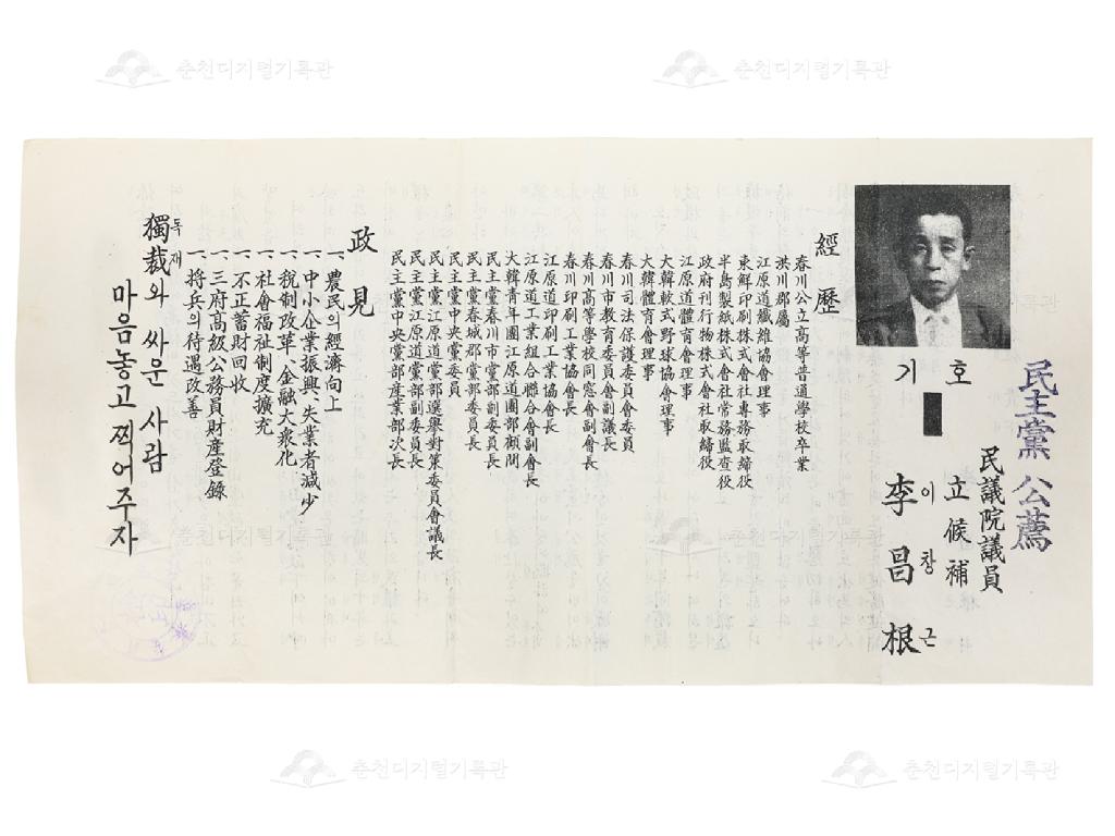 1960년 7월 민주당에서 공천한 춘성군 민의원 입후보자 이창근(李昌根)의 선거 홍보물이다. 앞면에는 기호, 성명, 경력, 정견, 선거구호가 기재되어 있고 뒷면에는 인사말씀이 기재되어 있다.