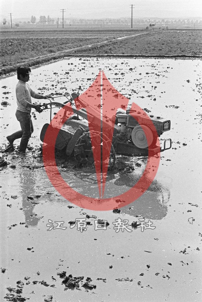 트랙터로 모내기 준. 장소미상