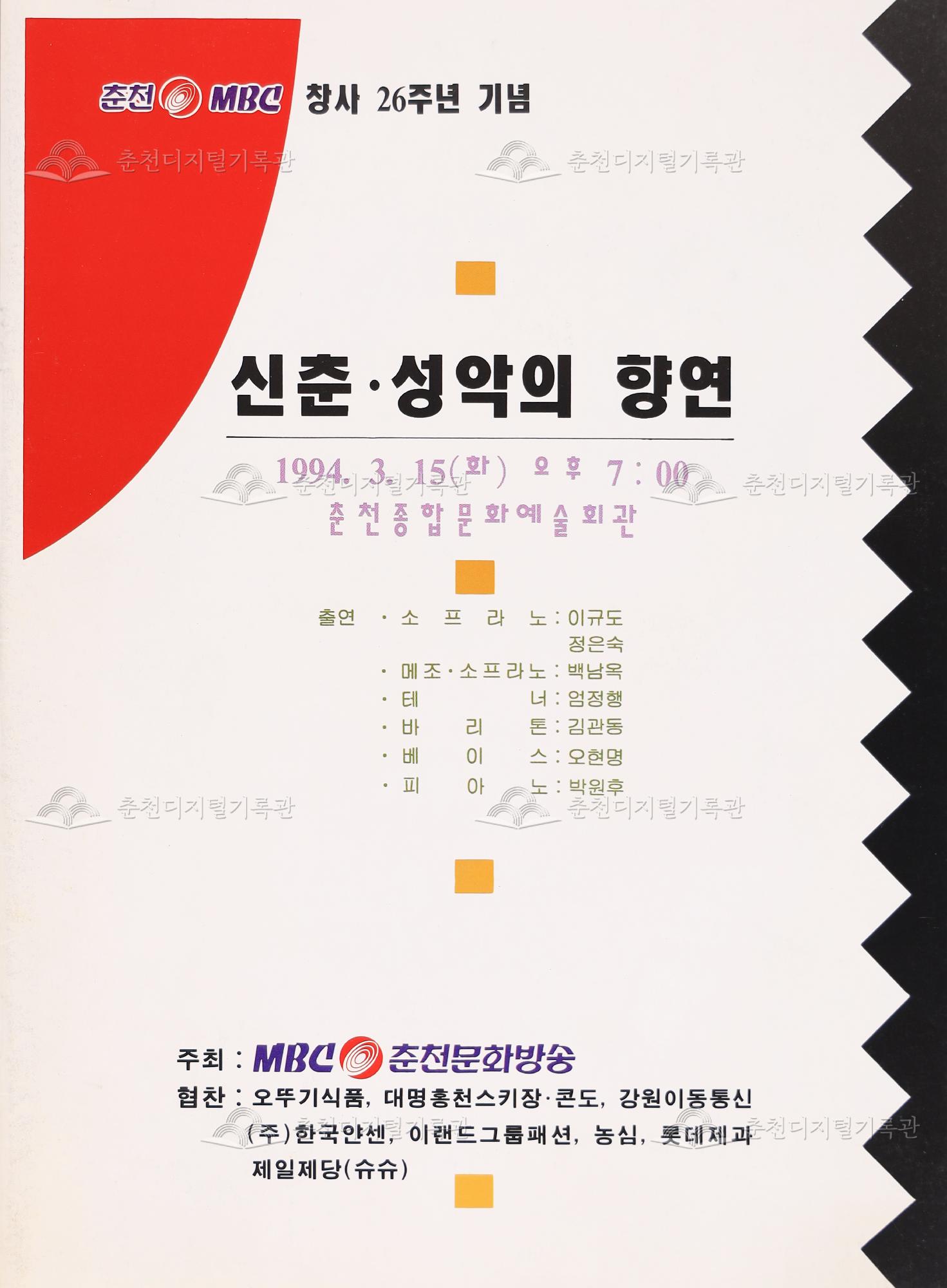 1994년 3월 15일 MBC춘천문화방송이 주최하고 오뚜기식품, 대명홍천스키장·콘도, 강원이동통신, ㈜한국얀센, 이랜드그룹패션, 농심, 롯데제과, 제일제당(슈슈)가 협찬하여 춘천종합문화예술회관(현.춘천문화예술회관)에서 개최한 춘천MBC창사26주년 기념 <신춘·성악의 향연> 공연의 팸플릿이다. 소프라노 이규도·정은숙, 메조소프라노 백남옥, 테너 엄정행, 바리톤 김관동, 베이스 오현명, 피아노 박원후가 출연하였다. 당시 춘천문화방송주식회사 사장은 이영익이었다. 춘천종합문화예술회관은 1993년 4월 10일에 개관하여 1995년에 시립 체육시설의 운영권을 통합해 '춘천문화체육예술회관'으로 개칭했다가 1996년 체육시설의 운영권을 분리하고 현재의 이름으로 고쳤다. 공연시설의 부족으로 어려움을 겪던 강원권 지역 최초의 공립 대규모 종합공연시설이었다.