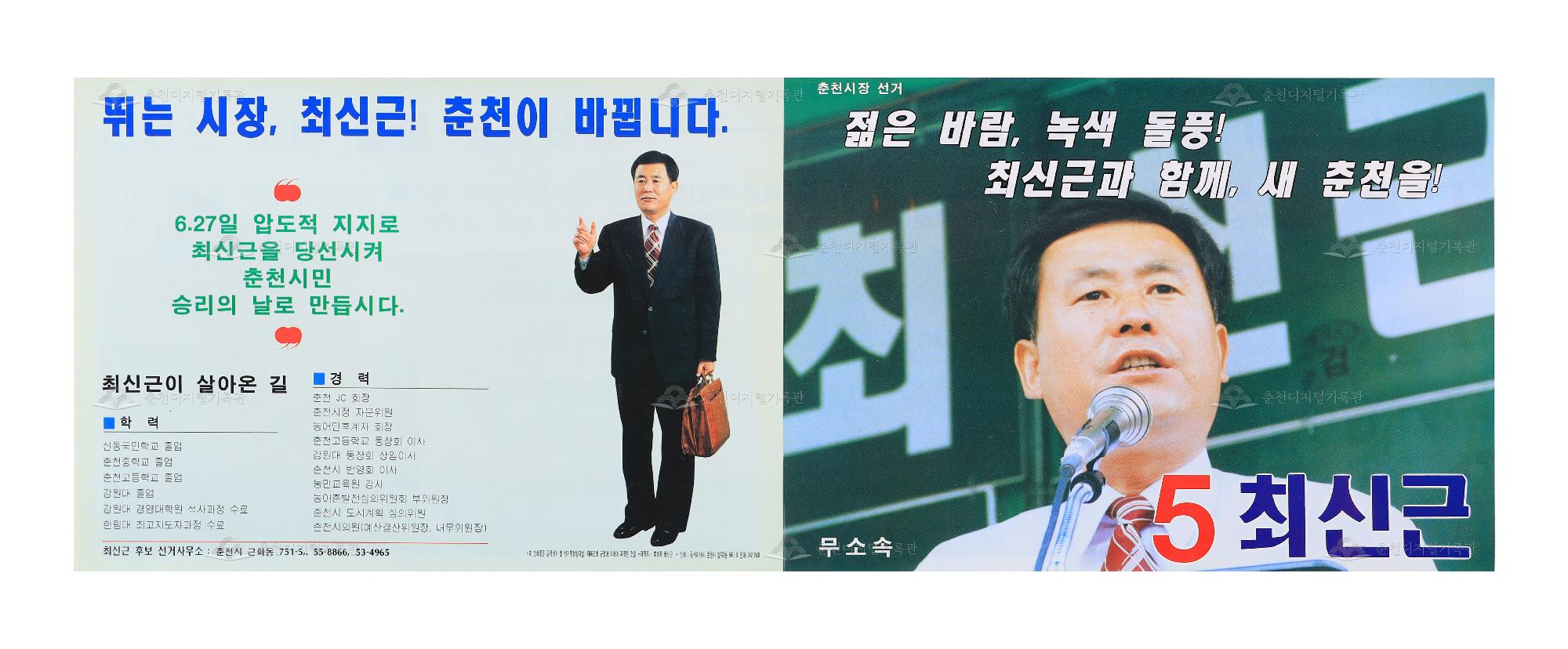 1995년 제1회 전국동시지방선거 중에서 춘천시장 후보로 출마한 기호5번 최신근의 선거 리플릿이다. 당시 춘천시장 후보로는 민주자유당 배계섭, 민주당 박환주, 자유민주연합 김진협, 무소속 장만준, 무소속 최신근, 무소속 한봉수 총6명이 출마하였다. 당시 춘천시의 선거인수는 160,271명이었는데 유효 투표수는 113,772표로 투표율이 70.99%였다. 이중에서 기호1번 민주자유당 배계섭이 46,712표(42.20%)표를 얻어 당선되었다. 기호5번 무소속 최신근은 8,895표(8.03%)표를 얻어 낙선하였다. 1995년 6월 27일 제1회 전국동시지방선거는 대한민국 첫 동시 지방선거로 투표율이 68.4%를 기록했다. 1991년에 지방선거가 부활되었으나 그동안 지방자치단체장 선거는 실시되지 못한 상태였는데, 정치개혁법이 통과됨에 따라 주민들이 직접선거로 지방자치단체장을 선출하게 되며 완벽한 지방자치제도가 실시되었다.