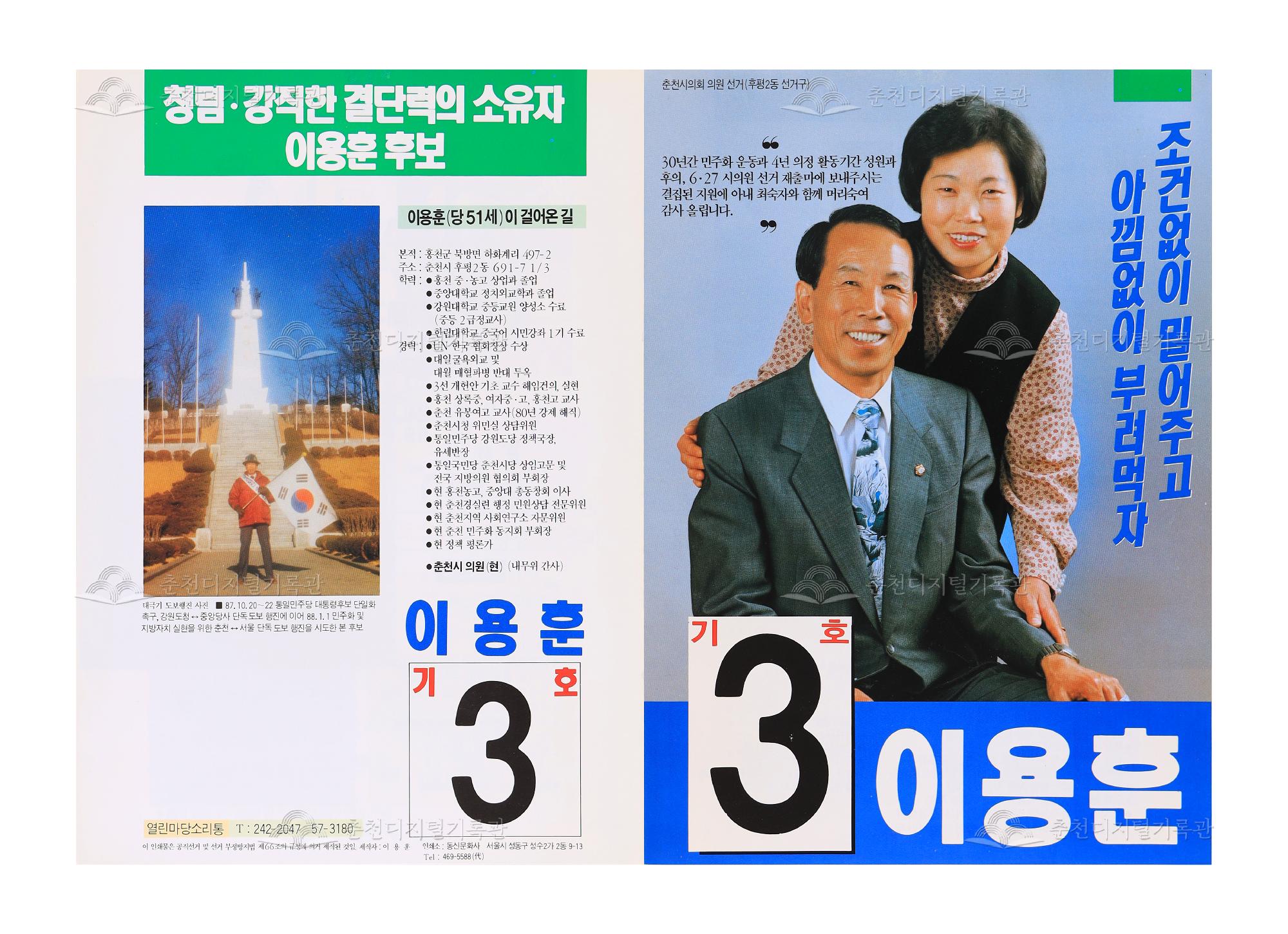 1995년 제1회 전국동시지방선거 중에서 춘천시의회의원 선거(후평2동선거구)에 출마하는 기호3번 이용훈 후보의 선거 리플릿이다. 당시 후평2동 선거구에서는 정재하, 박광택, 이용훈이 후보자로 나왔는데 11,153명의 유권자 중에서 7,250명이 선거에 참여하였고 이중 3,366표(46.42%)를 얻은 정재하가 당선되었다. 이용훈은 1,684표(23.22%)를 얻어 낙선하였다. 1995년 6월 27일 제1회 전국동시지방선거는 대한민국 첫 동시 지방선거로 투표율이 68.4%를 기록했다. 1991년에 지방선거가 부활되었으나 그동안 지방자치단체장 선거는 실시되지 못한 상태였는데, 정치개혁법이 통과됨에 따라 주민들이 직접선거로 지방자치단체장을 선출하게 되며 완벽한 지방자치제도가 실시되었다.
