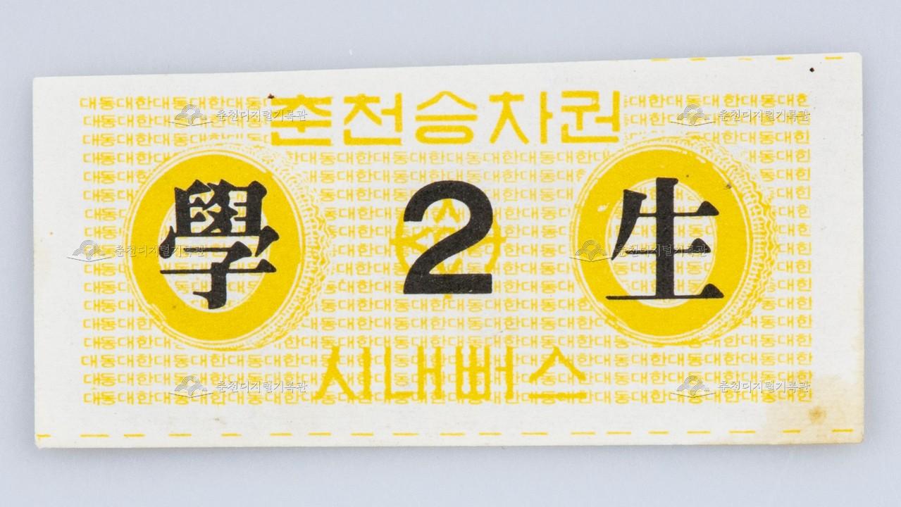 춘천시내버스 승차권 등록번호 00019567 생산일자 미상 생산지역 춘천 생산자 미상 수집처 연제철 소장자 연제철 내용 춘천시내버스 승차권-학생2 사용안내 비상업적 이용만 가능|©춘천디지털기록관 상업적 사용·수정·재배포는 저작권자 동의 필요 다운로드 목록보기