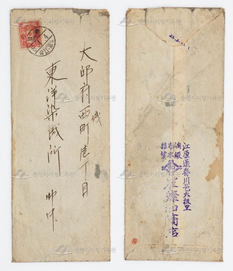 최찬화(崔燦和)상점 우편 등록번호 00019565 생산일자 1929.04.05 생산지역 춘천 생산자 미상 수집처 연제철 소장자 연제철 내용 일제시기인 1929년 춘천읍 대판리(大板里)에서 최찬화(崔燦和)상점에서 대구부 서성정(西城町) 동양염직소(東洋染織所)로 보낸 우편물 겉봉이다. 최찬화 상점은 주단(綢緞_비단), 포목, 잡화 등을 다루던 상점이었다. 자세히 보기 닫기 사용안내 비상업적 이용만 가능|©춘천디지털기록관 상업적 사용·수정·재배포는 저작권자 동의 필요 다운로드 목록보기