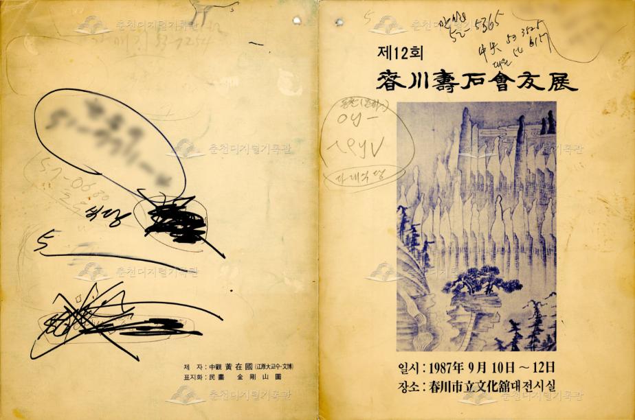 1987년 9월 10일부터 12일까지 3일 간 춘천시립문화관 대전시실에서 개최된 춘천수석회우전 리플릿이다 모두 4면으로 1면에 전시회 제목, 일시, 장소가, 2면에는 회장 국회의원 홍종욱의 초대의 글, 3면에는 회원 명단이, 4면에는 표지 제자, 표지화 정보가 기재되어 있다. 제자(題字)는 강원대 황재국 교수가 쓰고, 표지화는 금강산도가 쓰였다. 춘천수석회는 1976년 결성되어 매년 수석 전시회를 개최하였다. 1980~90년대에는 수석 취미 열풍으로 춘천에 4~5개의 수석회가 활동하였다.
