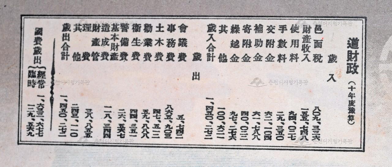 강원도현세지도_강원도재정 등록번호 00019535 생산일자 1936 생산지역 강원도 생산자 미상 수집처 연제철 소장자 연제철 내용 강원도 현세지도(1936.7.15.동아일보 부록)에 실려있는 강원도 재정 현황이다. 세입, 세출, 국비세출 예산이 기재되어 있다. 자세히 보기 닫기 사용안내 비상업적 이용만 가능|©춘천디지털기록관 상업적 사용·수정·재배포는 저작권자 동의 필요 다운로드 목록보기