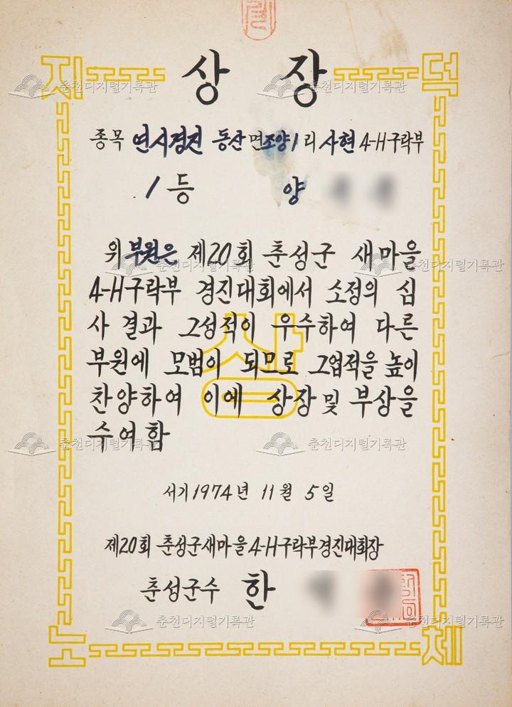연시경진대회 상장 등록번호 00019557 생산일자 1974.11.05 생산지역 춘천 생산자 춘성군 수집처 연제철 소장자 연제철 내용 1974년 11월 5일 제20회 춘성군 새마을 4-H구락부 경진대회에서 연시 경진 종목에 출전한 동산면 조양1리 사현 4-H구락부 양OO에 대해 1등상을 수여한 상장이다. 자세히 보기 닫기 사용안내 비상업적 이용만 가능|©춘천디지털기록관 상업적 사용·수정·재배포는 저작권자 동의 필요 다운로드 목록보기