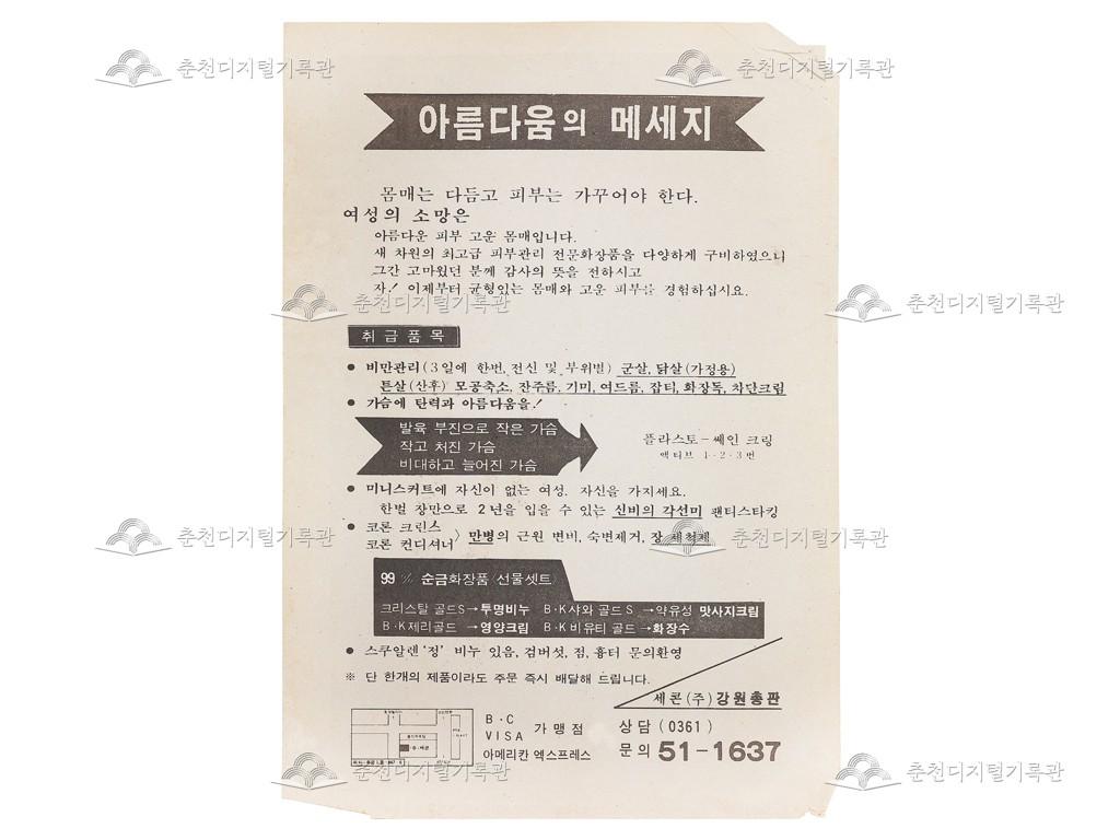 홍보 전단지(세콘㈜ 강원총판) 등록번호 00017790 생산일자 미상 생산지역 미상 생산자 미상 수집처 연제철 소장자 연제철 내용 몸매관리 홍보 전단 광고,옛 춘천 지역번호0361(현재033)을 볼 수 있다. 사용안내 비상업적 이용만 가능|©춘천디지털기록관 상업적 사용·수정·재배포는 저작권자 동의 필요 목록보기