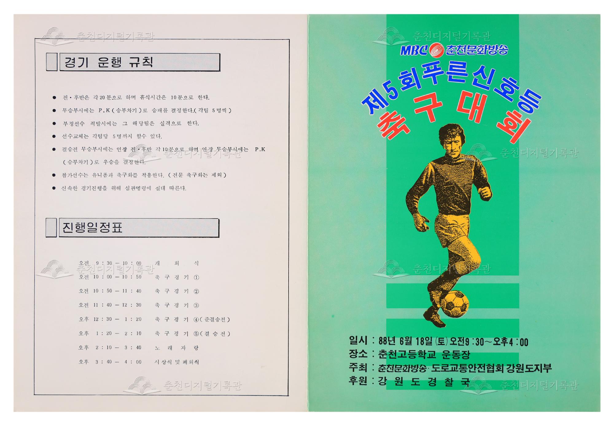 1988년 6월 18일 춘천고등학교운동장에서 춘천문화방송, 도로교통안전협회강원도지부가 주최하고 강원도경찰국이 후원하여 개최된 <제5회 MBC 춘천문화방송 푸른신호등 축구대회> 리플릿이다. 당시 춘천문화방송 대표이사 사장은 황영선, 도로교통안전협회 강원도지부장은 이흥군이었다. 대회에 참여한 회사 및 기관은 회사택시, 현대자동차, 화물조합, 춘천경찰서, 도로교통안전협회, 도경찰국, MBC, 개인택시, 강원운수, 대동·대한운수였다. 이 대회는 1981년 춘천MBC 개국이후 최장수 프로그램중 하나인 교통가족대상 프로그램 <푸른신호등>과 관계가 있는 교통관계자(운수업계,교통관련업체, 유관기관 종사자)들이 한자리에 모여 축구를 통한 친목과 우의를 증진하기 위한 목적으로 MBC가 마련한 <춘천MBC 사장기쟁탈 제1회 교통관계자 친선축구대회>가 시작이었다. 이후 3년동안 중단되었다가 1985년 <푸른 신호등 축구대회>로 대회명칭을 변경하고 1986년부터 도로교통안전협회도지부와 공동으로 하여 매년 연례행사로 개최하게 되었다.