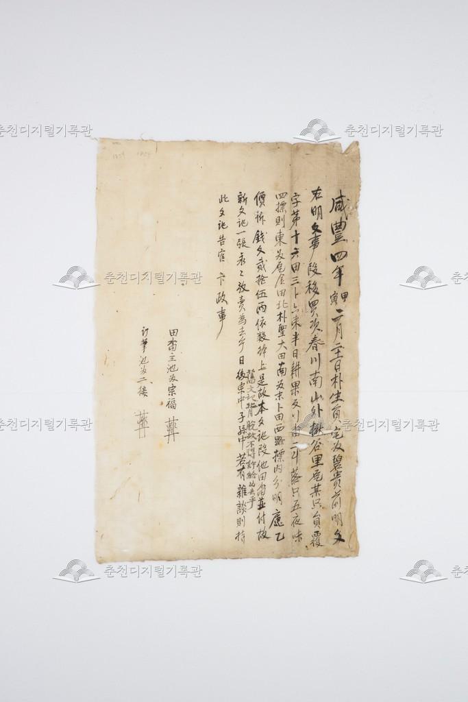 대상 토지의 소재지는 춘천(春川) 남산외(南山外) 추곡리(楸谷里) 돌모지원(乭某只員)이며, 이곳은 현재 춘천시 남면 추곡리 일대로 짐작된다. 세부 위치는 복자(覆字) 자호(字號) 16지번이다. 면적은 3짐[卜] 6뭇[束], 반일경(半日耕)과 밭을 논으로 바꾼 반행답(反行畓) 2마지기[斗落只], 5배미[夜味]이다. 사표(四標)를 살펴보면 동쪽에는 노비 돌쇠[乭金]의 밭, 북쪽에는 박성대(朴聖大)의 밭, 남쪽에는 말복(末卜)의 밭이 있고, 서쪽으로는 길이 나 있다. 토지의 매도 가격은 동전 25냥이다. 조선시대에는 토지의 지번을 천자문의 순서로 매겼고, 세부 지번은 一, 二, 三으로 기재하였다. 면적의 표시는 수확량, 파종량, 경작시간 등을 기준으로 산출하여 기재하였는데 이 문서에 기재된 짐[負 혹은 卜]은 수확량, 마지기[斗落只]는 파종량, 배미[夜味]는 두렁수를 이른다.