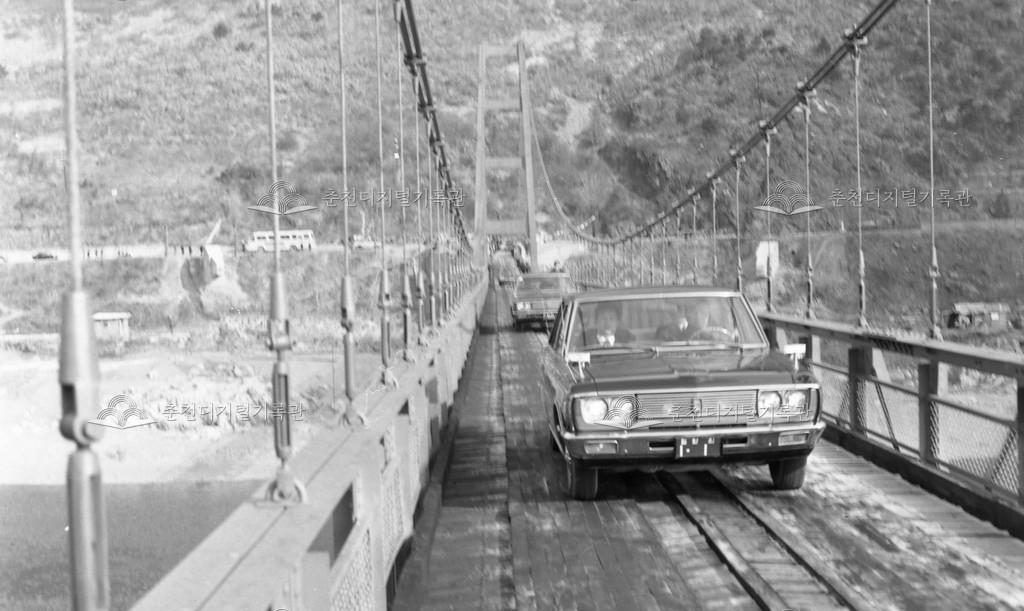 등선교 개통식 등록번호 00016501 생산일자 1972.12.29 생산지역 남산면 강촌리 생산자 미상 수집처 이경애 소장자 이경애 내용 1972년 12월 29일 남산면 등선교(출렁다리) 개통식과 함께 최초로 다리를 건너는 기관장 차량의 모습이다. 사용안내 비상업적 이용만 가능|©춘천디지털기록관 상업적 사용·수정·재배포는 저작권자 동의 필요 다운로드 목록보기