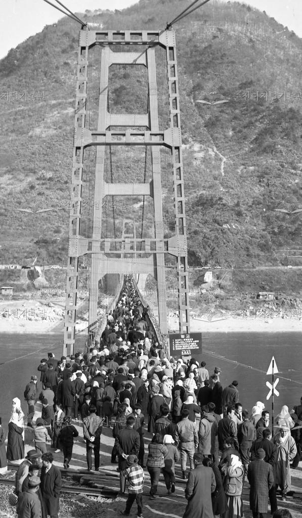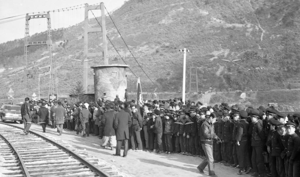 1972년 12월 29일 남산면 등선교 개통식 행사에 참석한 시민들의 모습이다. 당시 춘성군에서는 1973년 7월 5일 등선교 통행료 징수조례를 제정하여 교량의 안전관리를 위해 통행료를 징수했다. 소형승용차, 2톤 이하 소형화물차, 사람만 통과할 수 있게 하고 소형승용차, 소형화물차, 삼륜차는 100원, 이륜차, 우마차는 50원, 손수레 30원, 사람(7세 이상)은 10원을 받았다.