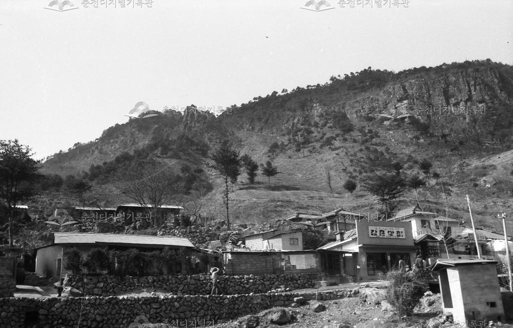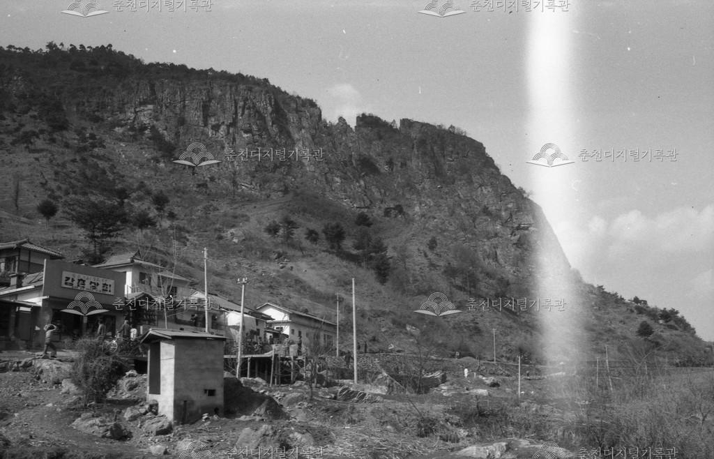 강촌리 풍경 등록번호 00016505 생산일자 1971 생산지역 남산면 강촌리 생산자 미상 수집처 이경애 소장자 이경애 내용 1971년 등선교가 생기기 전 남산면 강촌리의 옛 모습이다. 강촌상회 간판과 좌수봉이 보인다. 사용안내 비상업적 이용만 가능|©춘천디지털기록관 상업적 사용·수정·재배포는 저작권자 동의 필요 다운로드 목록보기