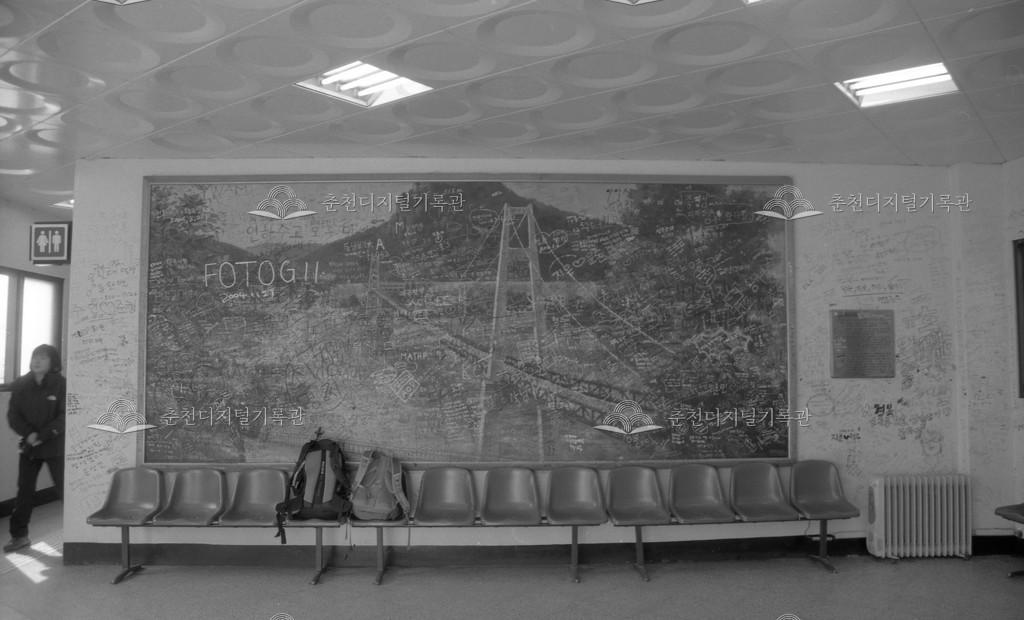 강촌역 내부 등록번호 00016510 생산일자 1998 생산지역 남산면 강촌리 생산자 미상 수집처 이경애 소장자 이경애 내용 1998년 남산면 강촌역사 내부 매표소 내 풍경이다. 등선교(출렁다리) 대형사진에 MT왔던 젊은이들의 낙서가 가득하다 사용안내 비상업적 이용만 가능|©춘천디지털기록관 상업적 사용·수정·재배포는 저작권자 동의 필요 다운로드 목록보기