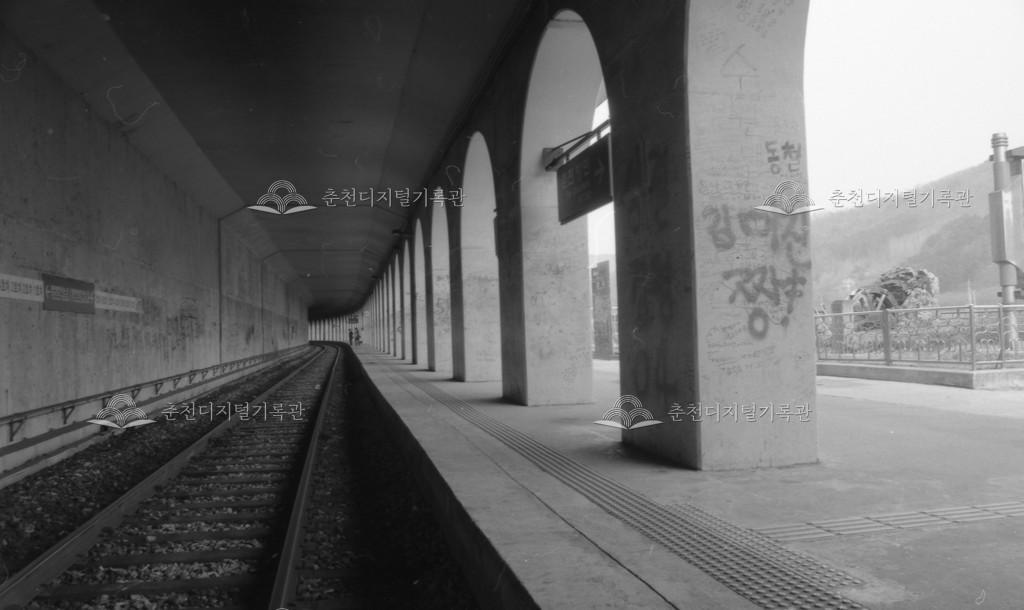 강촌역 피암터널 등록번호 00016512 생산일자 1998 생산지역 남산면 강촌리 생산자 미상 수집처 이경애 소장자 이경애 내용 1998년 벌집모양으로 설계된 강촌역 피암터널의 모습이다. 기둥 빽빽히 MT온 젊은이들의 낙서로 가득하다. 사용안내 비상업적 이용만 가능|©춘천디지털기록관 상업적 사용·수정·재배포는 저작권자 동의 필요 다운로드 목록보기