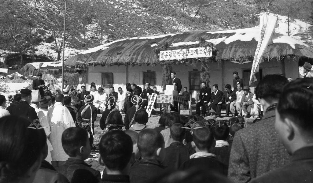 동면 품안출장소 개소식 등록번호 00016562 생산일자 미상 생산지역 동면 품안리 생산자 미상 수집처 이경애 소장자 이경애 내용 1960년대 동면 품안출장소 개소식 행사 모습이다. 초가집 청사의 모습에서 1960년대 시대적 상황을 엿볼 수 있다. 사용안내 비상업적 이용만 가능|©춘천디지털기록관 상업적 사용·수정·재배포는 저작권자 동의 필요 다운로드 목록보기