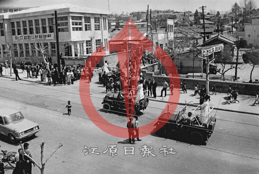 1969년 중앙로 1가에서 펼쳐진 강원일보 주최 미스강원선발대회 입상자 시가 퍼레이드. 우측 강원일보 사옥, 죄측 춘천경찰서