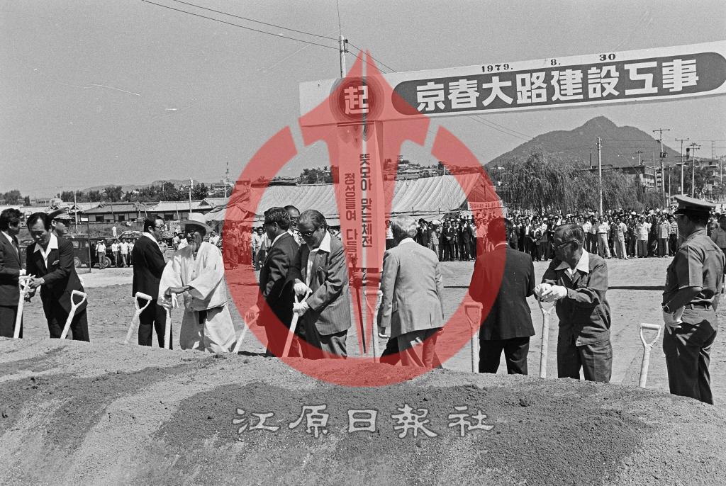 1979년 8월 30일 효자동 남부사거리 부근에게 열린 경춘대로 건설공사 기공식 현장. 사진 뒤편으로 봉의산과 약사동 망대가 보인다.