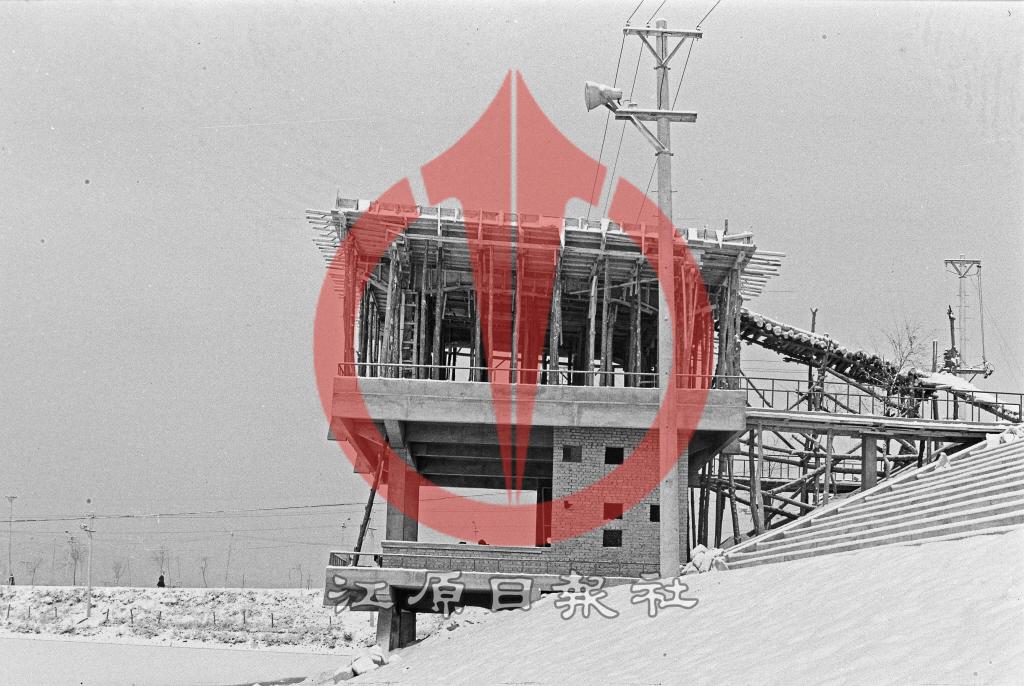 아이스링크 전망대와 스탠드 공사 현장. 제52회 전국체전 동계대회 빙상경기가 열린 공지천 특설링크에 전망대(본부석-2층 에머럴드 카페)와 스탠드가 1970년 12월23일 완공. 현재 아이스링크는 매립되어 조각공원을 활용.(현대건축)