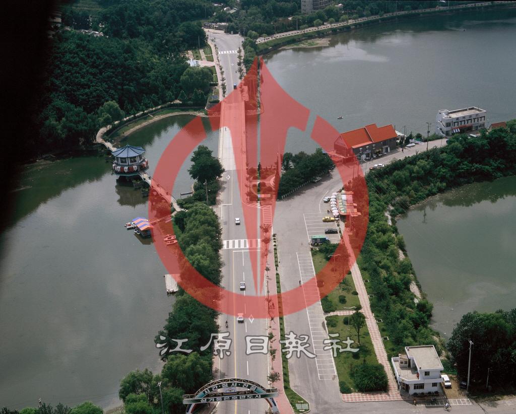 1984년 근화동 공지천 인근 항공촬영. 공지천 매립 전으로 팔각정, 공지천 옛 다리. 공지천교, 이디오피아의 집, 명덕회관(강원도노인복지회관) 등이 보인다.