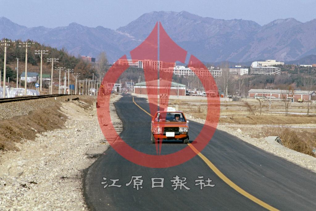 퇴계동에서 신동면 신남역(현 김유정역) 방향 도로 포장 공사. 좌측으로 경춘철도, 정면 상단에 강원대학교가 보인다.