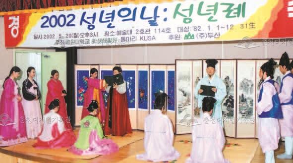 강원대학교 성년의 날 성년례 행사 등록번호 00019123 생산일자 2002.05.20 생산지역 효자동 생산자 강원대학교 개교60주년 기념사업 추진위원회 수집처 강원대학교 소장자 강원대학교 내용 성년의 날 성년례 행사(2002.05.20.) 『강원대학교 60년_개교 60주년 기념 화보집(2008)』 사진발췌 사용안내 비상업적 이용만 가능|©춘천디지털기록관 상업적 사용·수정·재배포는 저작권자 동의 필요 다운로드 목록보기