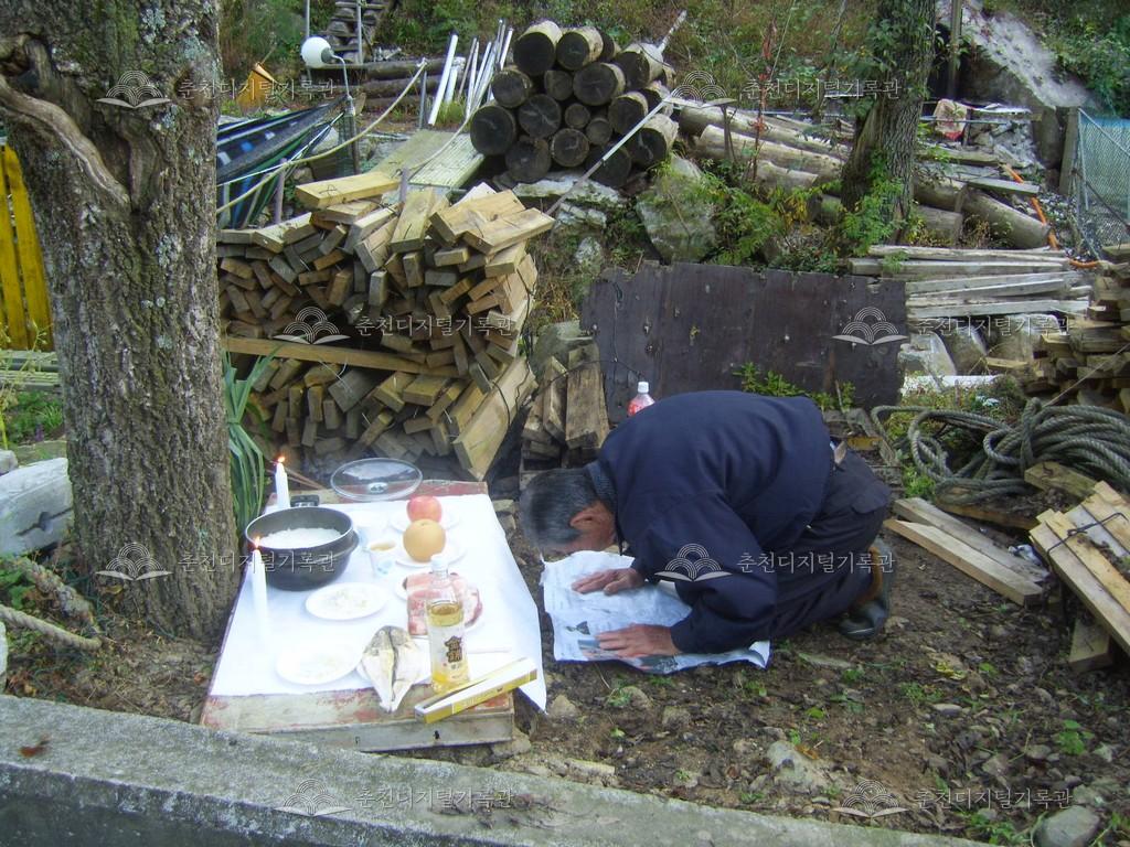 내평리 수살제 등록번호 00006865 생산일자 2010.10.16 생산지역 춘천시 북산면 내평리 생산자 이학주 수집처 이학주 소장자 춘천학연구소 내용 내평리 주민들이 스무나무 밑에서 수살제를 지낸 후 예단을 거는 장면이다. 수살제는 보통 마을의 수호신으로 여기는 마을 어귀의 돌이나 나무 등에 지내는 마을 제사를 일컫는다. 내평리에서 수살제는 서낭제와 같이 매년 음력 9월 9일에 지낸다. 자세히 보기 닫기 사용안내 비상업적 이용만 가능|©춘천디지털기록관 상업적 사용·수정·재배포는 저작권자 동의 필요 다운로드 목록보기