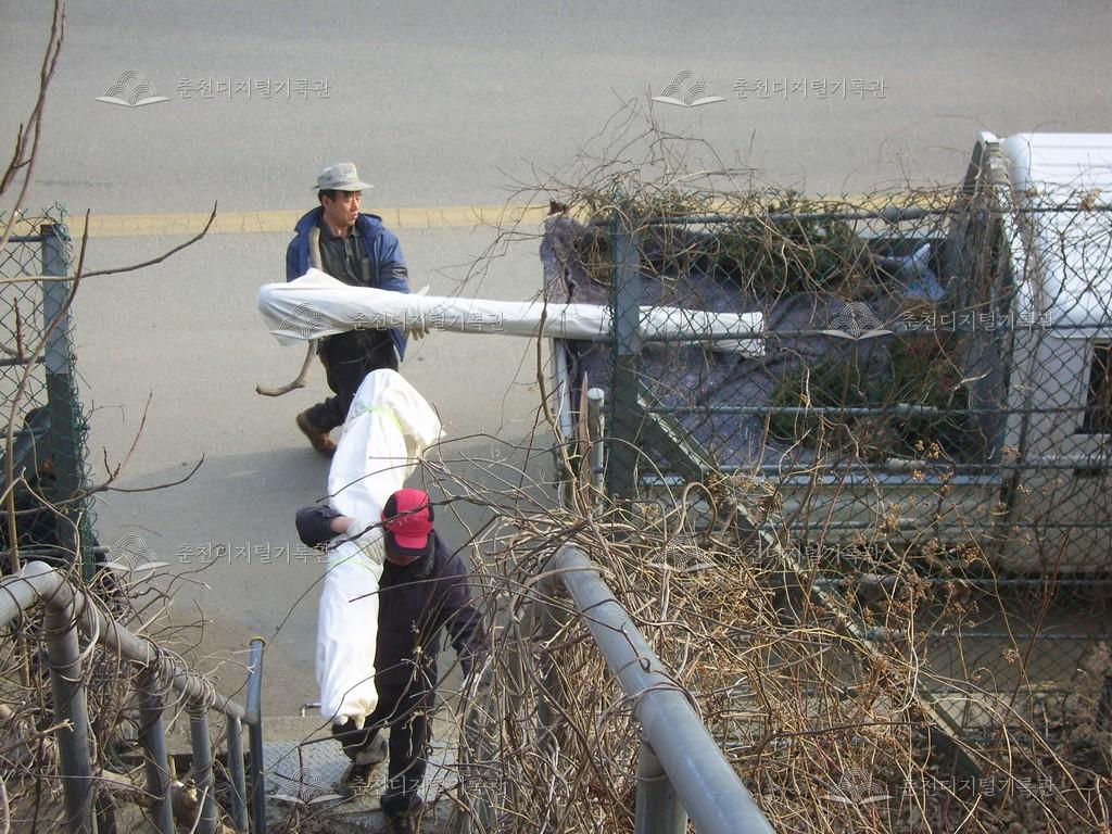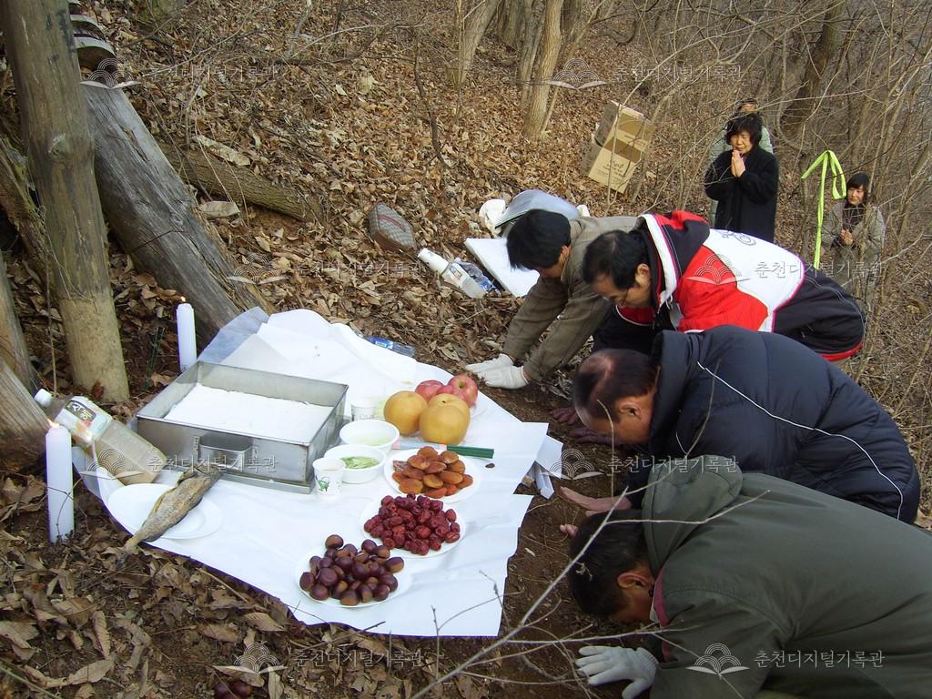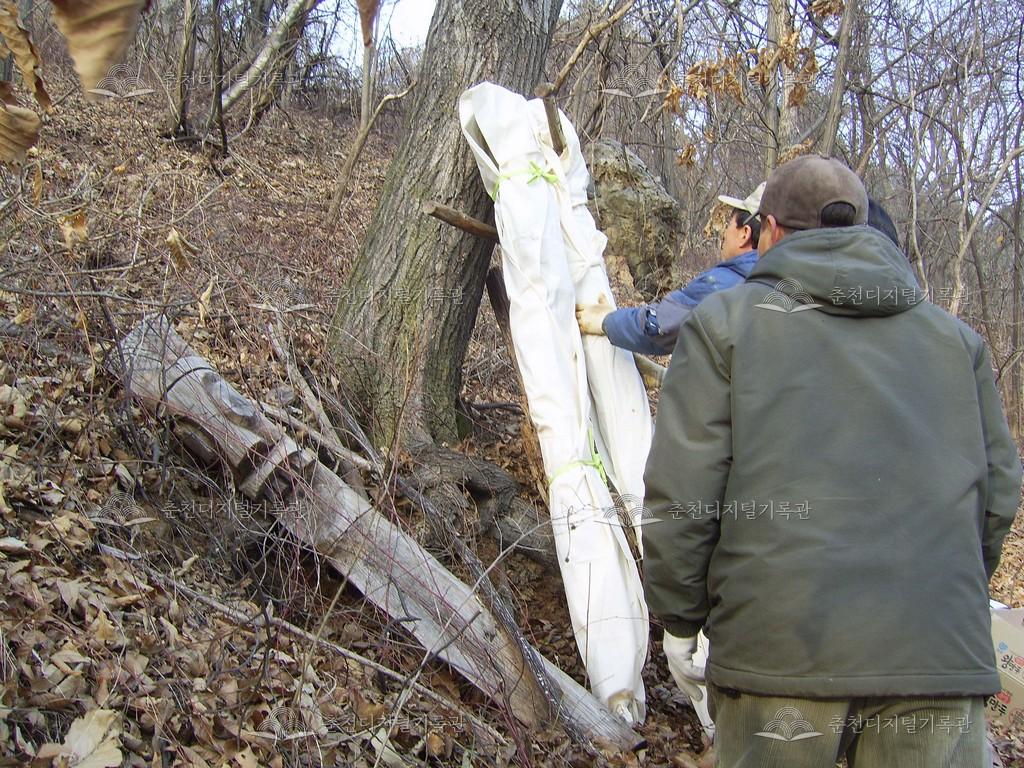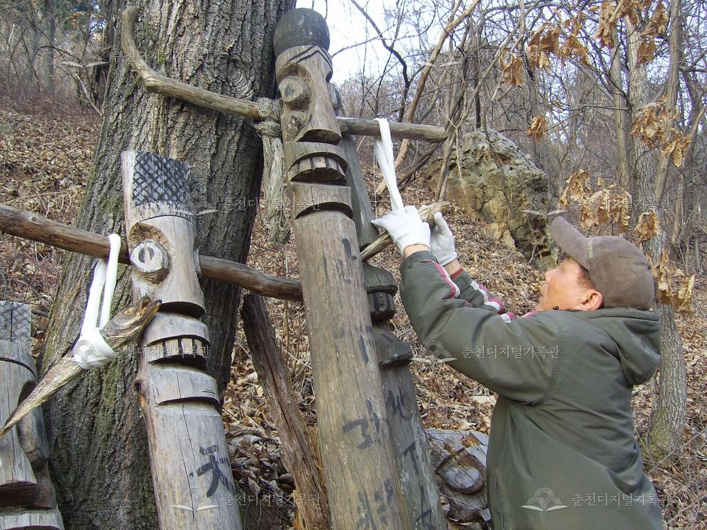 방하리 장승제 등록번호 00006870 생산일자 2009.02.25 생산지역 춘천시 남산면 방하리 생산자 이학주 수집처 이학주 소장자 춘천학연구소 내용 방하리 장승제는 음력 2월 1일에 지낸다. 사진은 2009년 2월 1일에 행했던 장승제의 모습이다. 장승제를 지내기 전 실과 북어를 장승에 걸고, 청평호 방하리 배터에 있던 장승을 길 옆 산으로 옮긴다. 자세히 보기 닫기 사용안내 비상업적 이용만 가능|©춘천디지털기록관 상업적 사용·수정·재배포는 저작권자 동의 필요 다운로드 목록보기