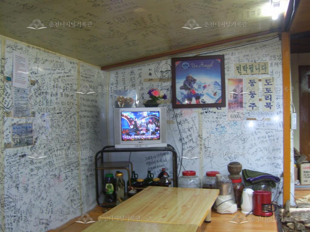 추곡약수터 약수식당 내부 등록번호 00006875 생산일자 2009.04.14 생산지역 춘천시 북산면 추곡리 산259-5 생산자 이학주 수집처 이학주 소장자 춘천학연구소 내용 추곡약수터 약수식당의 내부 모습이다. 약수식당을 운영하던 분이 추곡약수제(사명산신제)를 주관하였다. 이 식당에서 약수로 밥을 지어 판매하여 많은 사람들이 방문하였고, 식당 내부에 사인을 남겼다. 이 식당은 2021년경에 헐려서 없어졌다. 자세히 보기 닫기 사용안내 비상업적 이용만 가능|©춘천디지털기록관 상업적 사용·수정·재배포는 저작권자 동의 필요 다운로드 목록보기